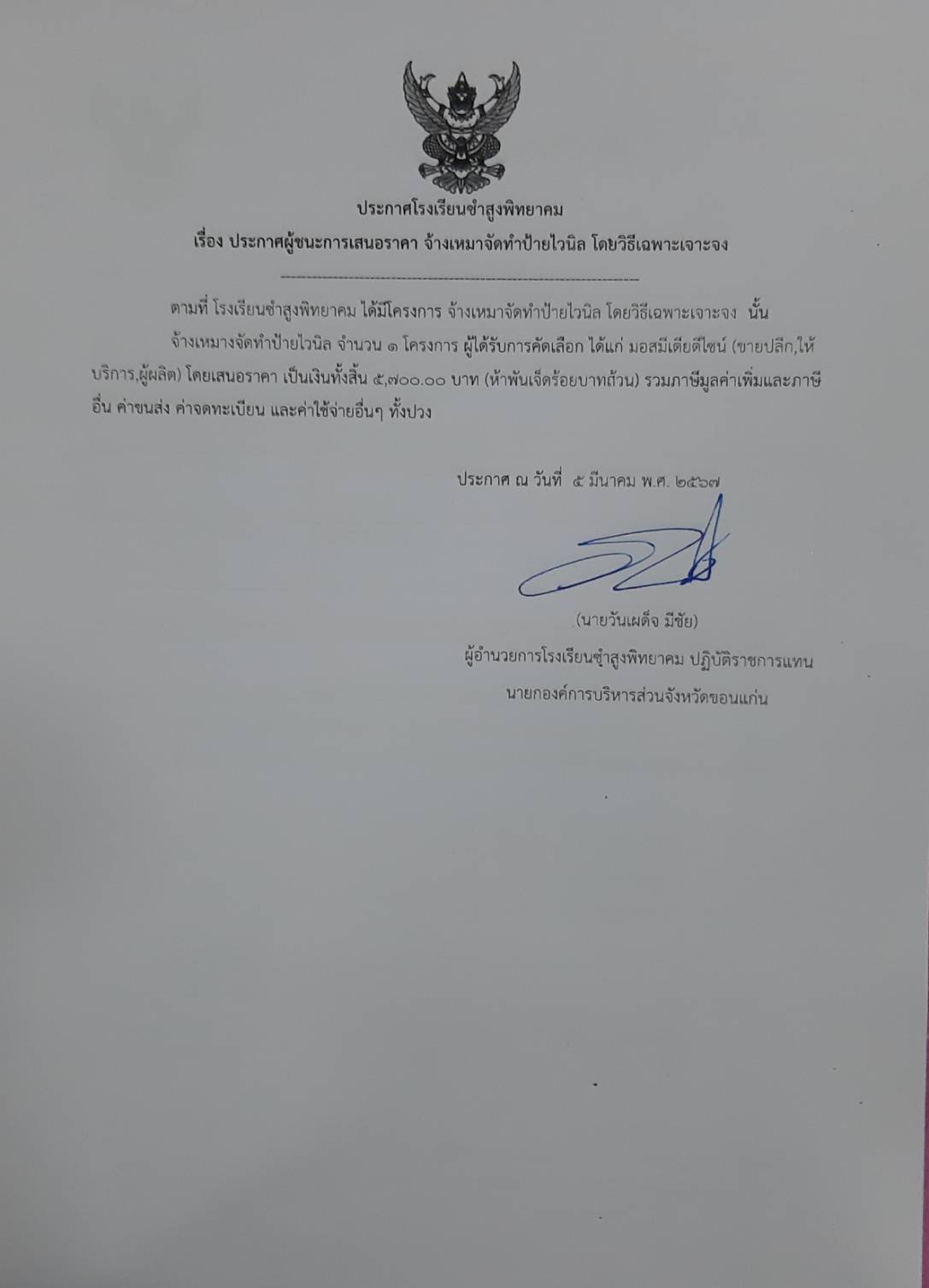 ประกาศโรงเรียนซำสูงพิทยาคม เรื่อง ประกาศผู้ชนะการเสนอราคา จ้างเหมาจัดทำป้ายไวนิล โดยวิธีเฉพาะเจาะจง