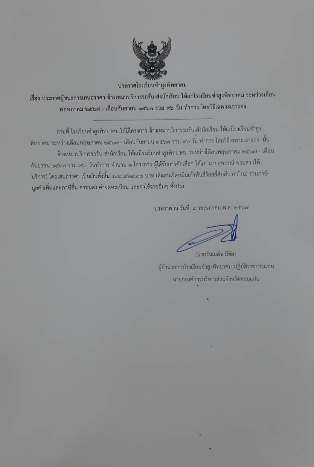 ประกาศโรงเรียนซำสูงพิทยาคม เรื่องประกาศผู้ชนะการเสนอราคา จ้างเหมาบริการรถรับ-ส่งนักเรียน ให้แก่โรงเรียนซำสูงพิทยาคม ระหว่างเดือนพฤษภาคม ๒๕๖๗-เดือนกันยายน ๒๕๖๗ รวม ๙๖ วันทำการ โดยวิธีเฉพาะเจาะจง