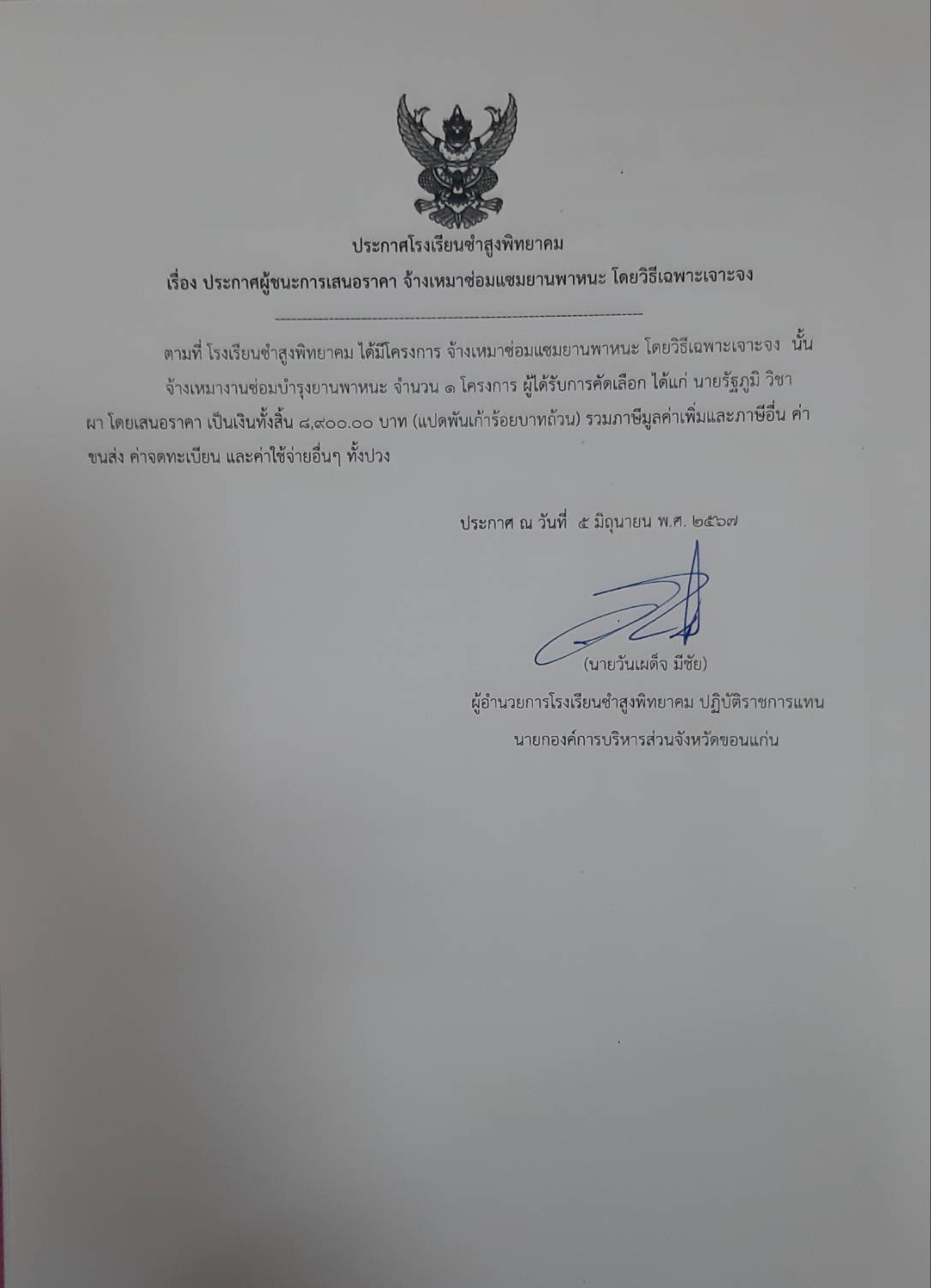 ประกาศโรงเรียนซำสูงพิทยาคม เรื่อง ประกาศผู้ชนะการเสนอราคา จ้างเหมาซ่อมแซมยานพาหนะ โดยวิธีเฉพาะเจาะจง