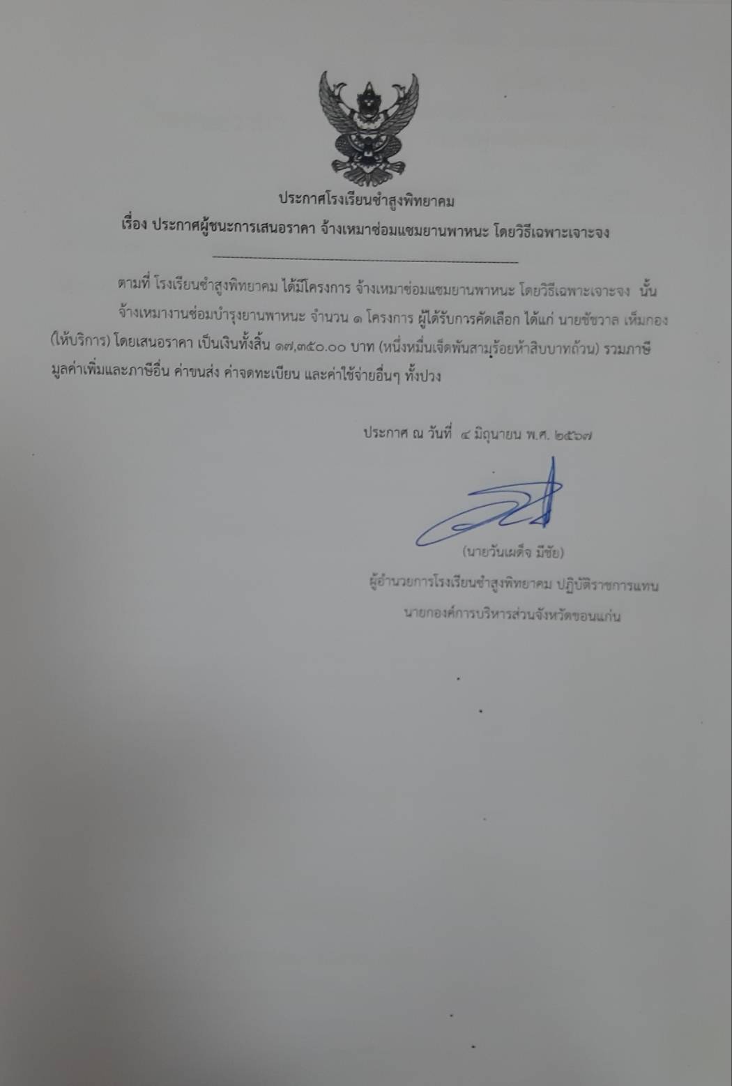 ประกาศโรงเรียนซำสูงพิทยาคม เรื่อง ประกาศผู้ชนะการเสนอราคา จ้างเหมาซ่อมแซมยานพาหนะ โดยวิธีเฉพาะเจาะจง