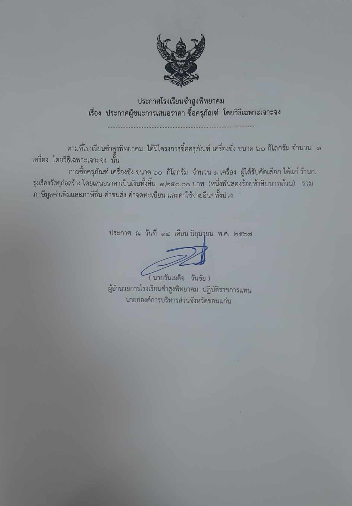 ประกาศโรงเรียนซำสูงพิทยาคา เรื่อง ประกาศผู้ชนะการเสนอราคา ซื้อครุภัณ์ โดยวิธีเฉพาะเจาะจง