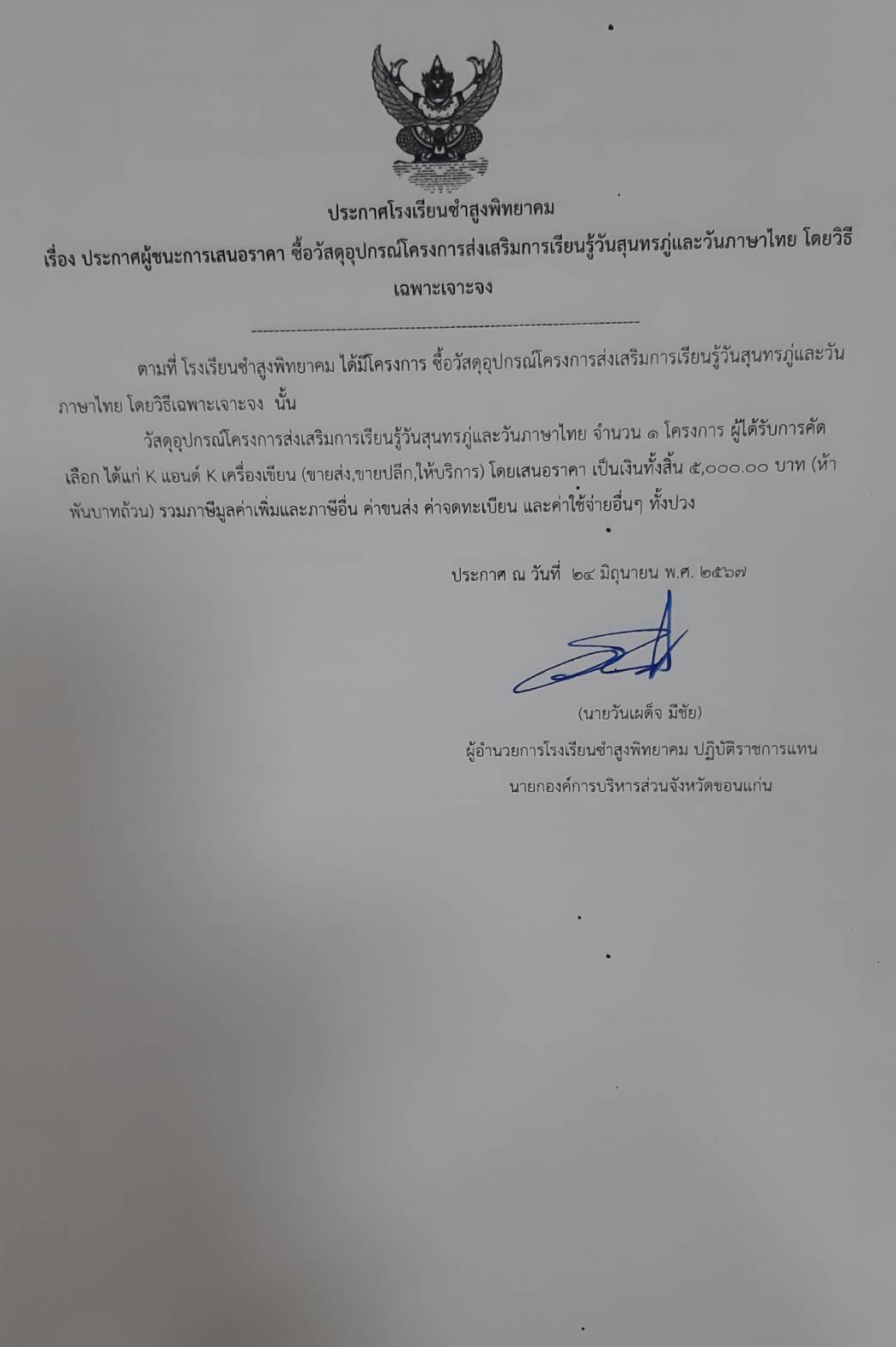 ประกาศโรเงรียนซำสูงพิทยาคม เรื่องประกาศผู้ชนะการเสนอราคา ซื้อวัสดุอุปกรณ์โครงการส่งเสริมการเรียนรู้วันสุนทรภู่และวันภาษาไทยโดยวิธีเฉพาะเจาะจง