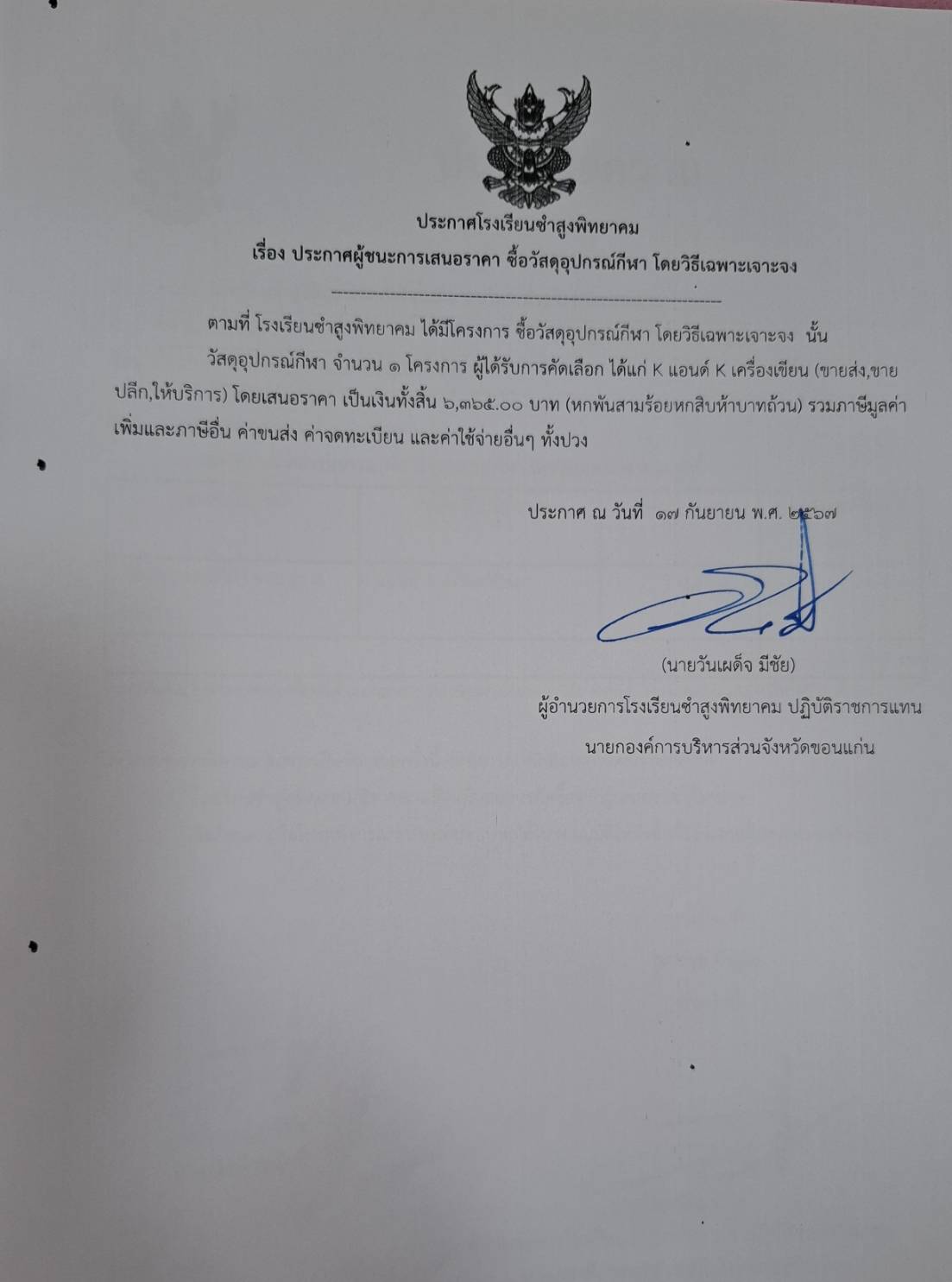ประกาศโรงเรียนซำสูงพิทยาคม เรื่องประกาศผู้ชนะการเสนอราคา ซื้อวัสดุอุปกรณ์กีฬา โดยวิธีเฉพาะเจาะจง
