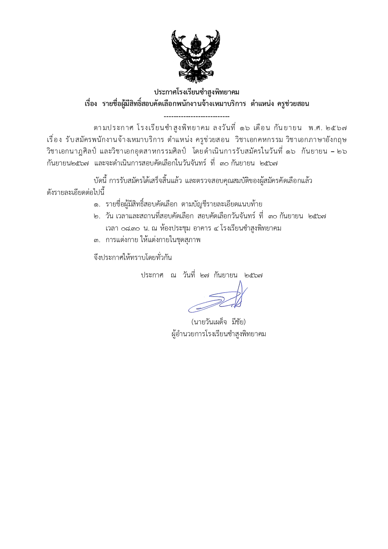 ประกาศโรงเรียนซำสูงพิทยาคม เรื่องประกาศรายชื่อผู้มีสิทธิ์สอบคัดเลือกพนักงานจ้างเหมาบริการ ตำแหน่ง ครูช่วยสอน