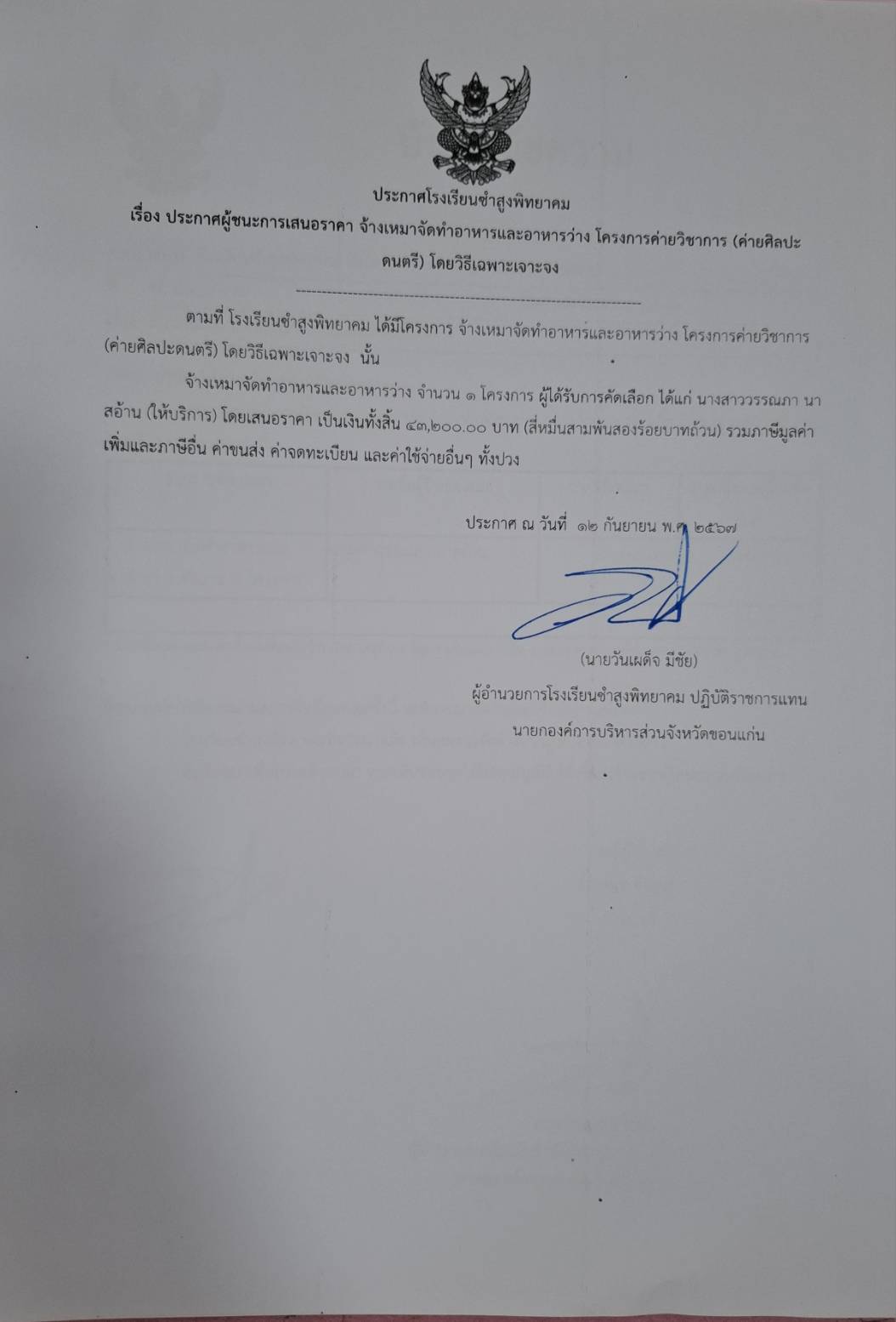 ประกาศโรงเรียนซำสูงพิทยาคม เรื่อง ประกาศผู้ชนะการเสนอราคา จ้างเหมาจัดทำอหารและอาหารว่าง โครงการค่ายวิชาการ (ค่ายศิลปะ ดนตรี-นาฏศิลป์)โดยวิธีเฉพาะเจาะจง