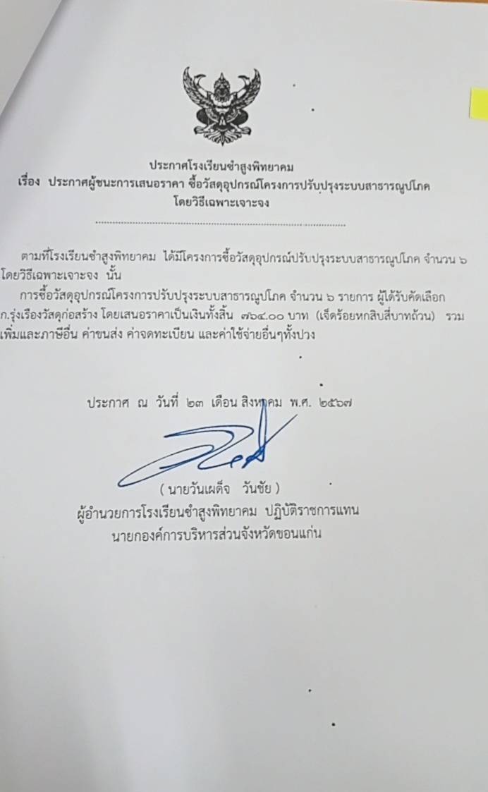 ประกาศโรงเรียนซำสูงพิทยาคม เรื่องประกาศผู้ชนะการเสนอราคา ซื้อวัสดุอุปกรณ์โครงการปรับปรุงระบบสาธารณูปโภค โดยวิธีเฉพาะเจาะจง