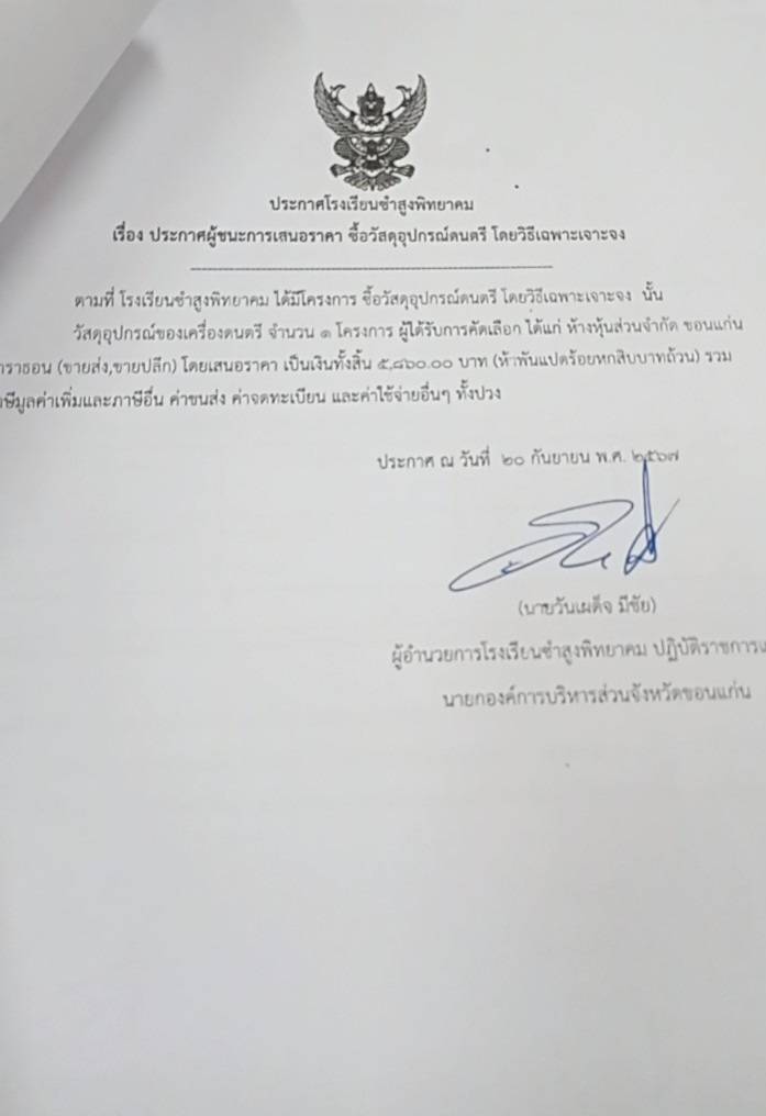 ประกาศโรงเรียนซำสูงพิทยาคม เรื่องประกาศผู้ชนะการเสนอราคา ซื้อวัสดุอุปกรณ์ดนตรี โดยวิธีเฉพาะเจาะจง