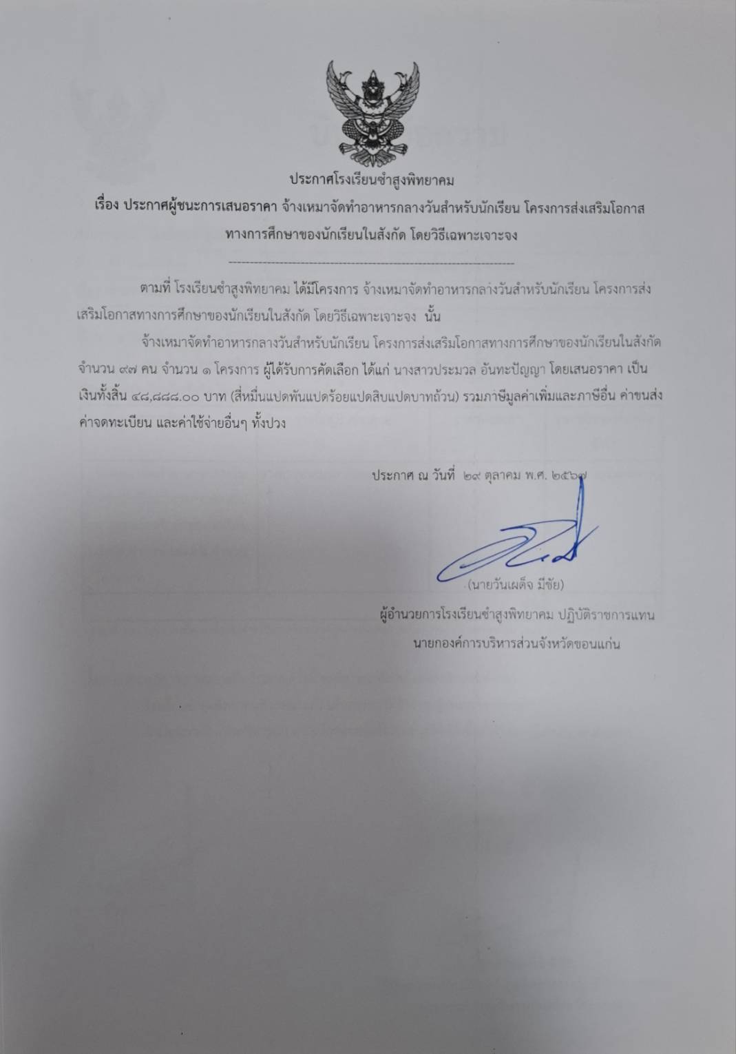ประกาศโรงเรียนซำสูงพิทยาคม เรื่อง ประกาศผู้ชนะการเสนอราคา จ้างเหมาจัดทำอาหารกลางวันสำหรับนักเรียนโครงการส่งเสริมโอกาสทางการศึกษาของนักเรียนในสังกัด โดยวิธีเฉพาะเจาะจง