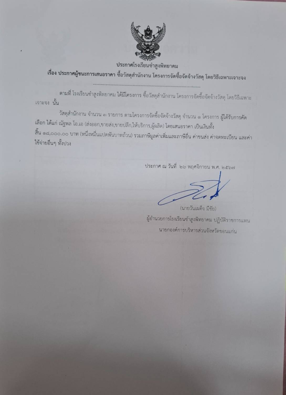 ประกาศโรงเรียนซำสูงพิทยาคม เรื่อง ประกาศผู้ชนะการเสนอราคา ซื้อวัสดุสำนักงาน โครงการจัดซื้อจัดจ้าง โดยวิธีเฉพาะเจาะจง