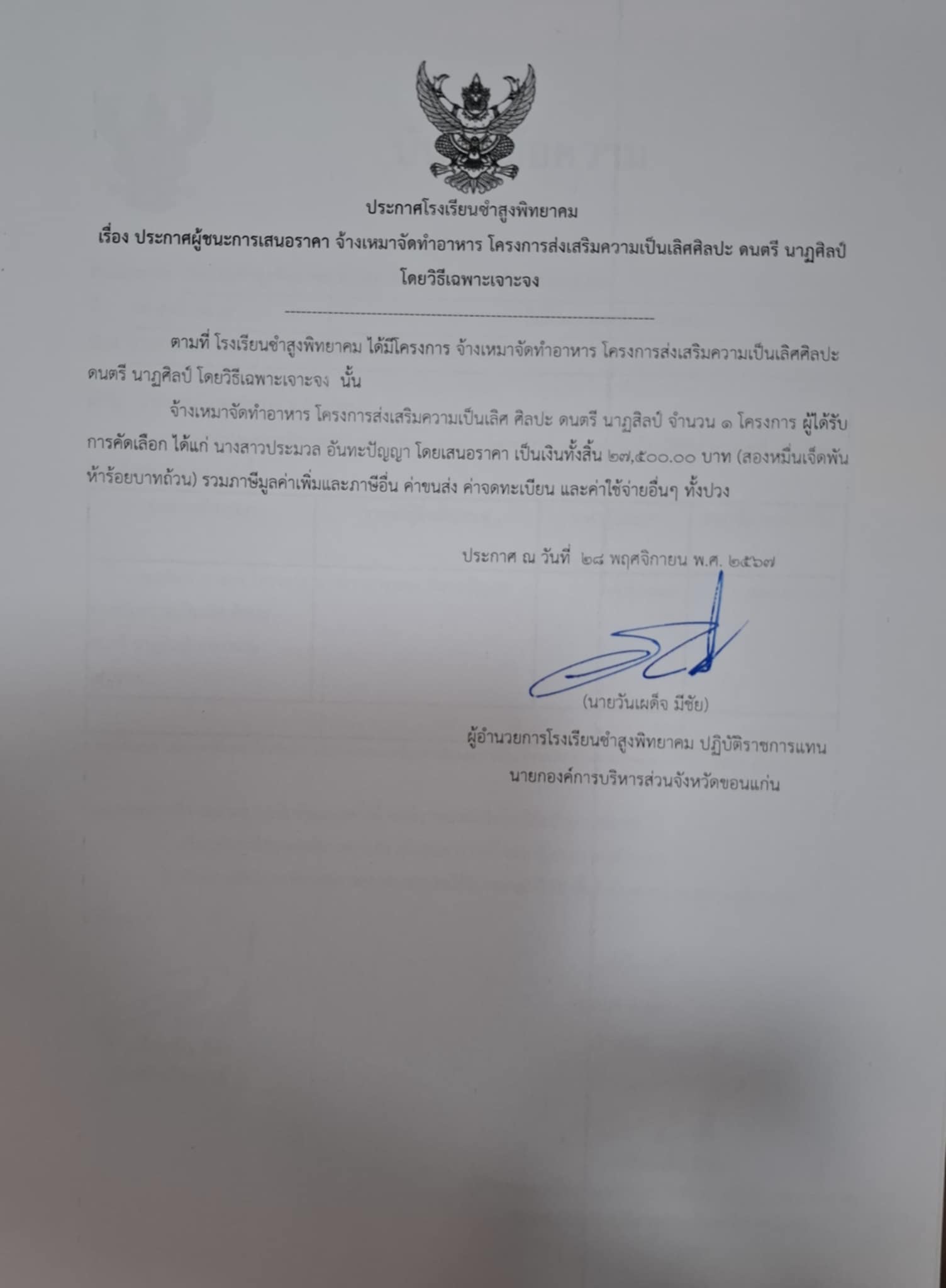 ประกาศโรงเรียนซำสูงพิทยาคม เรื่องประกาศผู้ชนะการเสนอราคา จ้างเหมาจัดทำอาหาร โครงการส่งเสริมความเป็นเลิศดนตรี ศิลปะ นาฏศิลป์ โดยวิธีเฉพาะเจาะจง