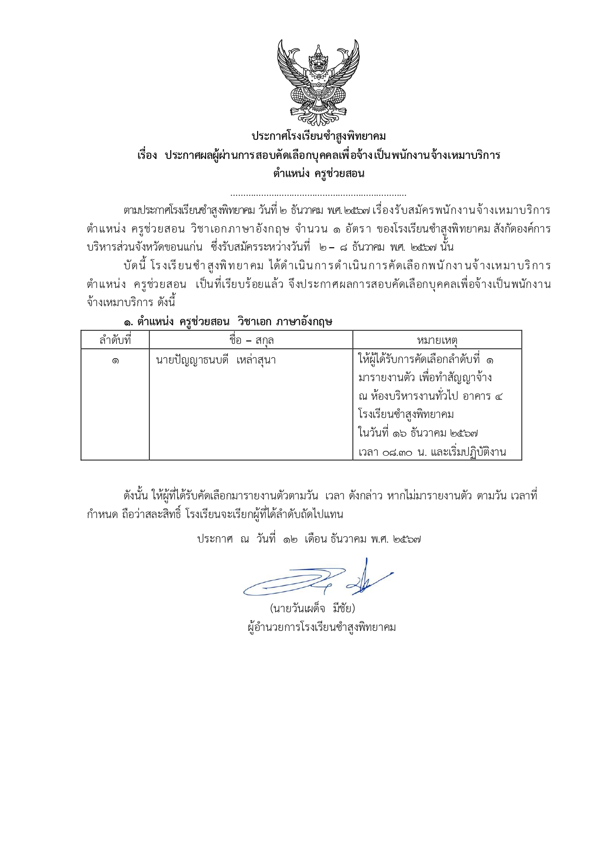 ประกาศโรงเรียนซำสูงพิทยาคม เรื่อง ประกาศผลผู้ผ่านการสอบคัดเลือกบุคคลเพื่อจ้างเป็นพนักงานจ้างเหมาบริการ ตำแหน่ง ครูช่วยสอน