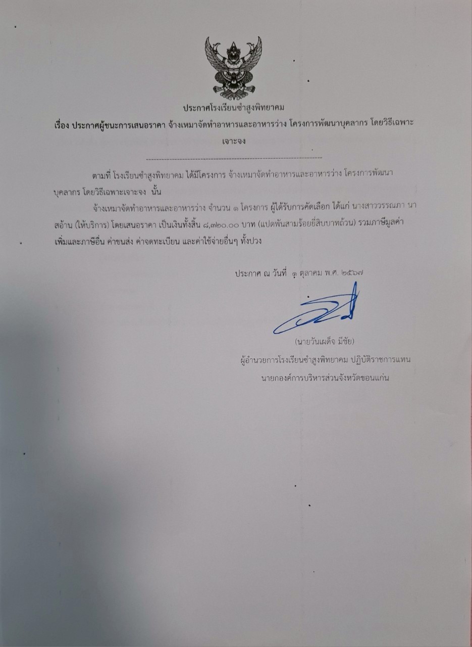 ประกาศโรงเรียนซำสูงพิทยาคม เรื่องประกาศผู้ชนะการเสนอราคาจ้างเหมาจัดทำอาหารและอาหารว่าง โครงการพัฒนาบุคลากร โดยวิธีเฉพาะเจาะจง