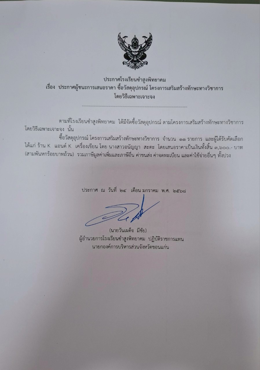 ประกาศโรงเรียนซำสูงพิทยาคม เรื่องประกาศผู้ชนะการเสนอราคา ซื้อวัสดุอุปกรณ์ โครงการเสริมสร้างทักษะทางวิชาการโดยวิธีเฉพาะเจาะจง