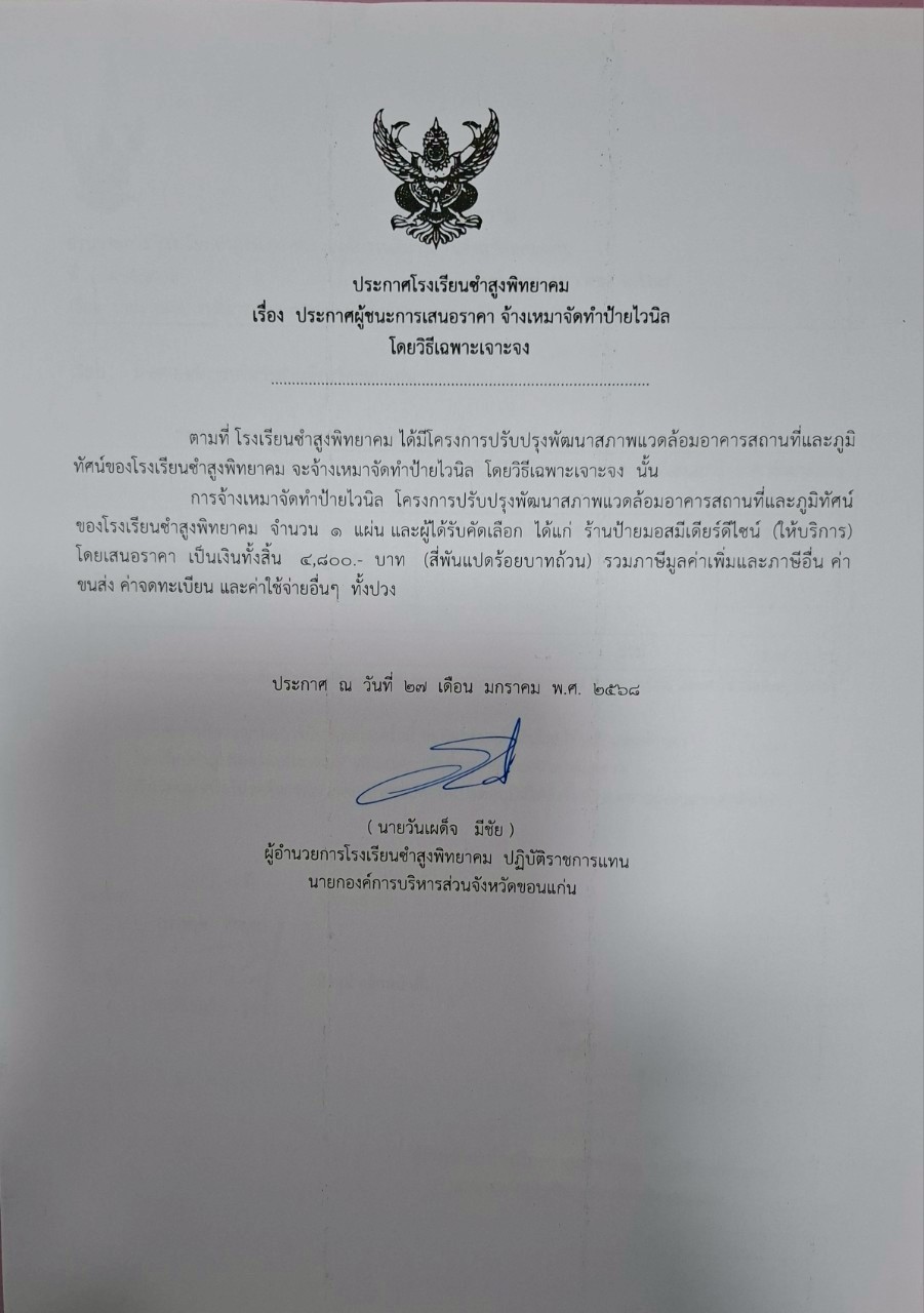 ประกาศโรงเรียนซำสูงพิทยาคม เรื่องประกาศผู้ชนะการเสนอราคาจ้างเหมาจัดทำป้ายไวนิล โดยวิธีเฉพาะเจาะจง