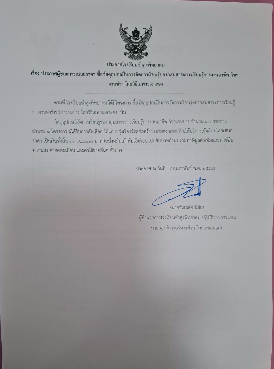 ประกาศโรงเรียนซำสูงพิทยาคม เรื่องประกาศผู้ชนะการเสนอราคา ซื้อวัสดุอุปกรณ์ในการจัดการเรียนรู้กลุ่มสาระการงานอาชีพ วิชางานช่าง โดยวิธีเฉพาะเจาะจง