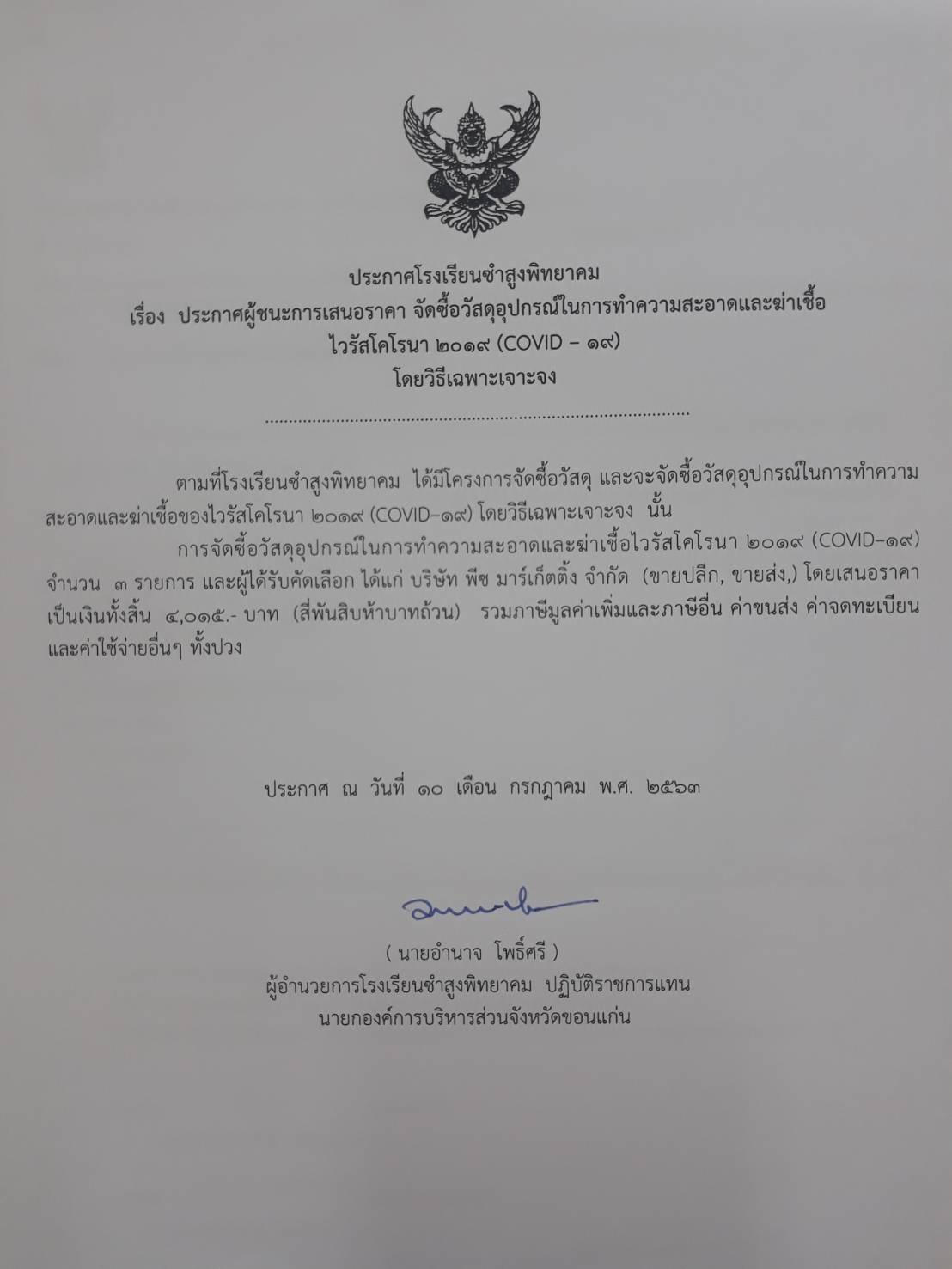 ประกาศผู้ชนะการเสนอราคา จัดซื้อวัสดุอุปกรณ์ในการทำความสะอาดและฆ่าเชื้อไวรัสโคโรน่า 2019