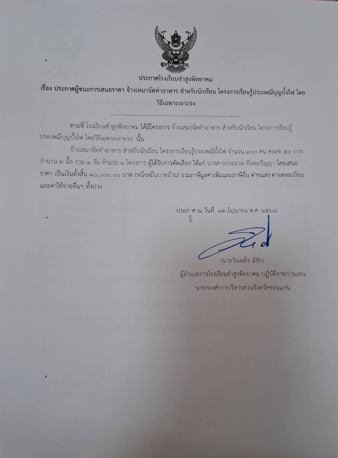 ประกาศโรงเรียนซำสูงพิทยาคม เรื่อง ประกาศผู้ชนะการเสนอราคา จ้างเหมาจัดทำอาหาร สำหรับนักเรียน โครงการเรียนรู้ประเพณีบุญบั้งไฟ โดยวิธีเฉพาะเจาะจง