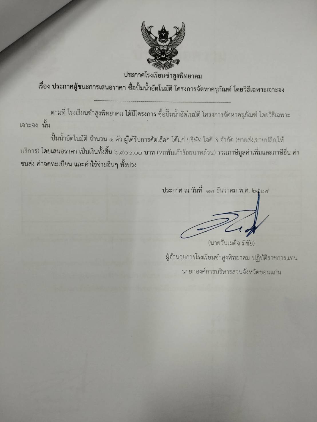 ประกาศโรงเรียนซำสูงพิทยาคม เรื่องประกาศผู้ชนะการเสนอราคา ซื้อปั๊มน้ำอัตโนมัติ โครงการจัดหาครุภัณฑ์ โดยวิธีเฉพาะเจาะจง