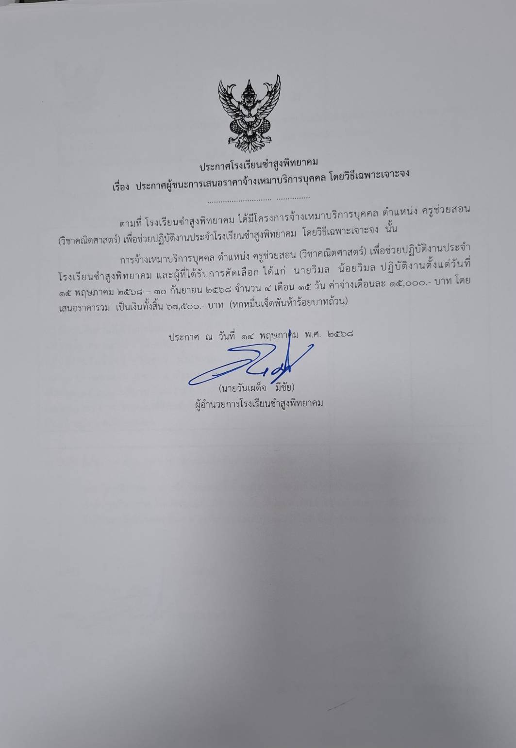 ประกาศโรงเรียนซำสูงพิทยาคม เรื่อง ประกาศผู้ชนะการเสนอราคา จ้างเหมาบริการบุคคล โดยวิธีเฉพาะเจาะจง
