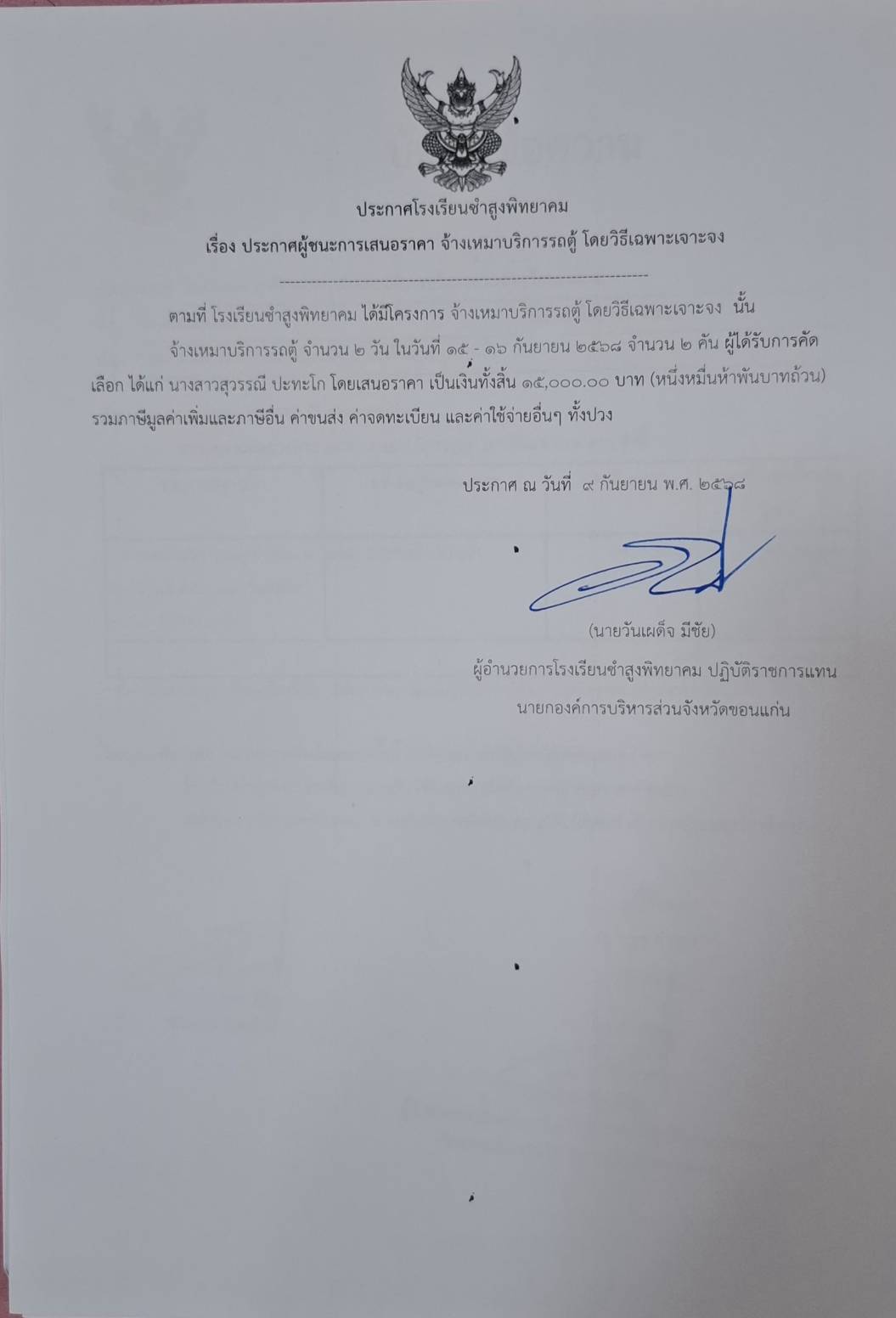 ประกาศโรงเรียนซำสูงพิทยาคม เรื่องประกาศผู้ชนะการเสนอราคา จ้างเหมารถตู้ โดยวิธีเฉพาะเจาะจง