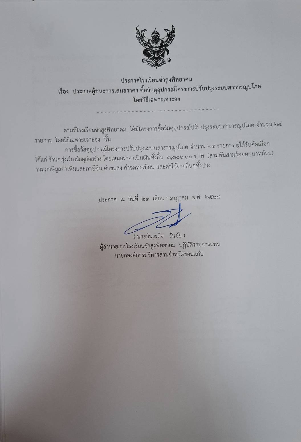 ประกาศโรงเรียนซำสูงพิทยาคม เรื่องประกาศผู้ชนะการเสนอราคา ซื้อวัสดุอุปกรณ์โครงการปรับปรุงระบบสาธารณูปโภค โดยวิธีเฉพาะเจาะจง
