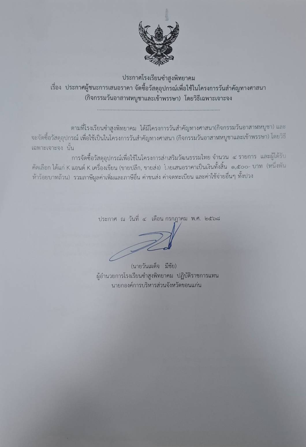 ประกาศโรงเรียนซำสูงพิทยาคม เรื่องประกาศผู้ชนะการเสนอราคา ซื้อวัสดุอุปกรณ์เพื่อใช้ในโครงการวันสำคัญทางศาสนา(กิจกรรมวันอาสาฬหบูชาและเข้าพรรษา โดยวิธีเฉพาะเจาะจง