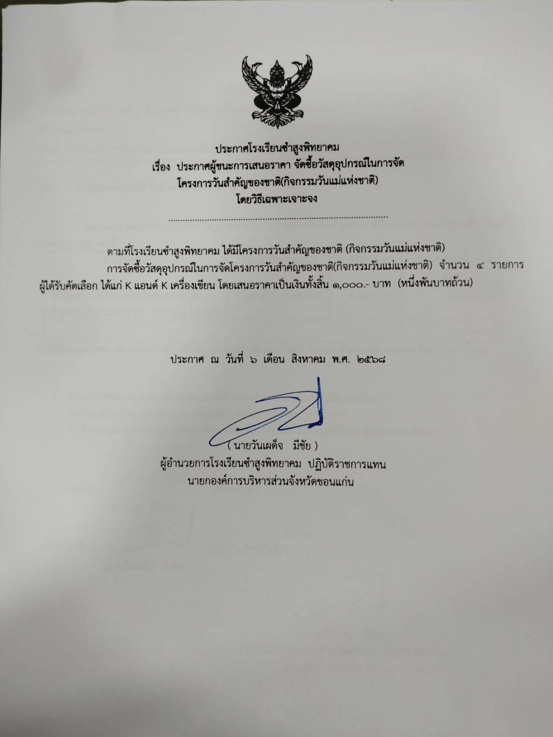 ประกาศโรงเรียนซำสูงพิทยาคม เรื่องประกาศผู้ชนะการเสนอราคา จัดซื้อวัสดุอุปกรณ์ในการจัดโครการวันสำคัญของชาติ (กิจกรรมวันแม่แห่งชาติ) โดยวิธีเฉพาะเจาะจง