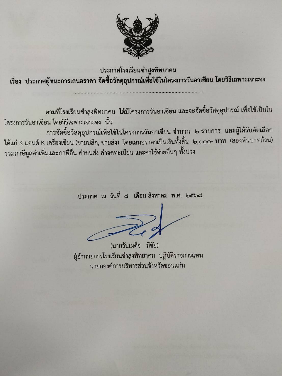 ประกาศโรงเรียนซำสูงพิทยาคม เรื่องประกาศผู้ชนะการเสนอราคา จัดซื้อวัสดุอุปกรณ์เพื่อใช้ในโครการวันอาเซียนโดยวิธีเฉพาะเจาะจง