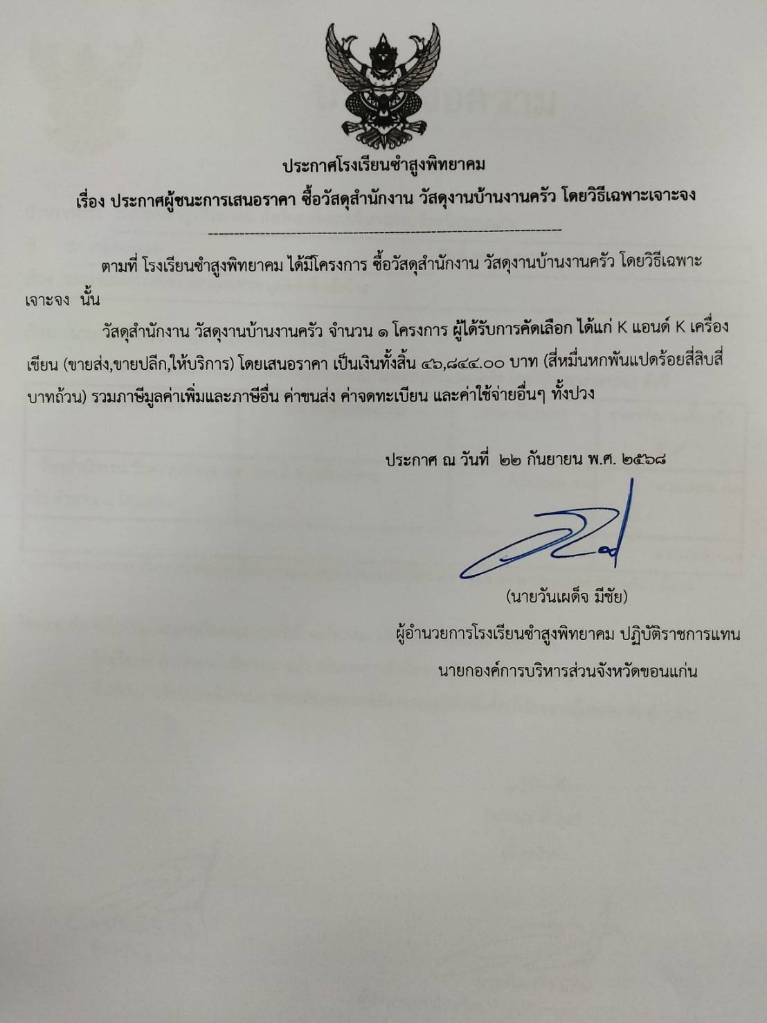 ประกาศโรงเรียนซำสูงพิทยาคม เรื่องประกาศผู้ชนะการเสนอราคา จัดซื้อวัสดุสำนักงาน วัสดุงานบ้านงานครัว โดยวิธีเฉพาะเจาะจง